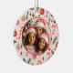 La foto de tus Navidades familiares se verá muy linda en este adorno de vacaciones divertidas. Este es un regalo maravilloso o un placer para tu propio árbol de Navidad. El patrón vintage presenta adornos baubles de vacaciones rosas y rojas, además de divertidos dulces y ramos de pino verde. También hay manantiales y bayas rojas. Todo ello en acuarela sobre un fondo estacional rosa claro. El diseño animado tiene un toque retro festivo. Por supuesto, la foto está pensada para ser reemplazada por una tuya propia. Al revés está "Feliz Navidad" en una bonita tipografía roja casual. Asegúrese de editar los nombres de familia de ejemplo y datar a su propia persona.
