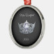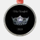 Ornamento de Navidad mostrado en forma redonda con una corona de plata con resaltado azul de medianoche en el centro, con texto de guión elegante en color gris plateado y negro. Mostrado con cinta roja y reborde plateado. Personalizar este elemento con su nombre personal de concurso, fecha u otro. Cambie el nombre de la muestra que aparece "Miss Westfield".