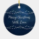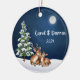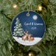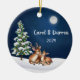 Celebra la magia de la temporada con este adorno bellamente personalizado que incluye dos ciervos resonando bajo un árbol de Navidad cubierto de nieve, iluminado por el suave resplandor de una luna llena contra un rico cielo azul oscuro. Esta cálida escena, acompañada de los primeros nombres de la pareja y del año, hace de ella un lugar perfecto para las parejas que celebran su amor durante las vacaciones. En la parte posterior del adorno se pueden ver las luces festivas de los Navidades y el mensaje "Feliz Navidad con amor", que también se puede personalizar. Este adorno es una adición encantadora y significativa a cualquier decoración de vacaciones, perfecta para regalar o conmemorar un año especial juntos.