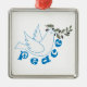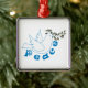 Ornamento personalizado de la paz con una paloma sosteniendo una rama de olivo y la palabra Paz a lo largo del pecho de la paloma con el signo de paz de los años 60.