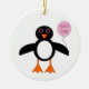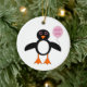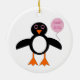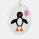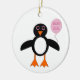 Este adorno tiene un personalizado adorable de un pingüino con ojos rosas, un pequeño pico naranja y una panza blanca. El pingüino sostiene un globo rosa pastel. Hay un texto rosa pálido dentro del globo que dice "Niña bebé". Este es el regalo perfecto para celebrar a una bebé recién nacida.