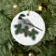 Este adorno de Chickadee presenta una pintura al óleo de arte digital de un garbanzo en una rama de pino con conos de pino.