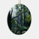 Brillantes rayos blancos del sol matutino fluyen desde detrás de ramas oscuras hacia un rico bosque de verano verde, con enormes árboles cubiertos de hiedra y un fértil maleza.