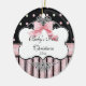 El primer adorno navideño del bebé incluye elegantes remolinos de copas franceses, puntos negros, rosas y verdes en el fondo y un hermoso arco rosa pintado a mano. Todo hecho con obras de arte originales de Audrey Jeanne Roberts. El resultado es un regalo de bebé bellamente contemporáneo. Al revés, hay el mismo patrón de puntos en un fondo blanco y un corchete que revela un lugar para la foto de su bebé. Puede agregar fácilmente su propia imagen o cambiar el mensaje. TAMBIÉN PODRÍAS DISFRUTAR: