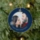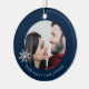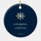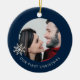 Celebra un hito especial con este adorno de Navidad Personalizada. Aprecie sus primeras vacaciones en pareja con este exquisito adorno que incluye una foto de personalizable enmarcada por un delicado copo de nieve sobre un rico fondo azul marino. El frente presenta elegantemente "Nuestra Primera Navidad" en los tercios inferiores, capturando la magia del momento. Gire para encontrar el copo de nieve adornado, listo para ser personalizado con sus nombres y el año memorable. Este único adorno es una adición perfecta a tu árbol y un maravilloso placer para marcar tu viaje juntos.