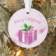 Añade un toque caprichoso a tu árbol de Navidad con un adorno de regalo para Navidades rosados. El diseño ornamental incluye un regalo vibrante de Navidades rosados adornado con bayas y copos de nieve cayendo contra un desplazamiento elegante y hojas de fondo. También hay artículos de regalo y de vacaciones disponibles con este diseño.