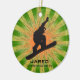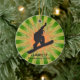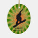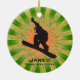 Snowboard Navidades de ornamentos personalizados 20XX. Un snowboarder posa en un tablero sobre un fondo verde y naranja de estrellas. ¡Todo el personalizable de texto, delante y atrás!