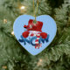 Un muñeco de nieve con mitones rojos y un gorra de corazones rojos y blancos disfruta el día con su amigo el cardenal rojo y el texto dice "NIEVE" en un porcelano Snowman y adorno de conservas de feriado cardinal.