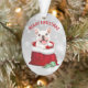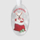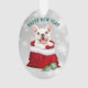 Un adorable Bulldog francés blanco sale de una bolsa de regalo roja en la parte delantera de este adorno navideño. Unas pocas bombillas verde azuladas y doradas de árboles de vacaciones yacen justo delante de la bolsa de Santa. El texto encima de la imagen dice "FELIZ NAVIDAD" en rojo. La imagen y el texto se colocan en un fondo de bokeh abstracto plateado. La parte posterior del adorno tiene la misma imagen, pero con el texto "AÑO NUEVO FELIZ" en verde verde azulado.
