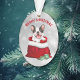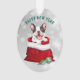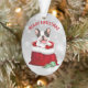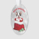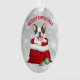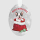 Un adorable Bulldog francés blanco y negro sale de una bolsa de regalo roja en la parte delantera de este adorno navideño. Unas pocas bombillas verde azuladas y doradas de árboles de vacaciones yacen justo delante de la bolsa de Santa. El texto encima de la imagen dice "FELIZ NAVIDAD" en rojo. La imagen y el texto se colocan en un fondo de bokeh abstracto plateado. La parte posterior del adorno tiene la misma imagen, pero con el texto "AÑO NUEVO FELIZ" en verde verde azulado.