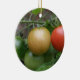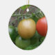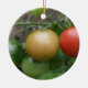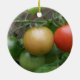 Este adorno de estilo bonito presenta una fotografía de un grupo de tomates maduros que incluyen un tomate rojo, naranja y verde en una línea, que crece en una planta de tomate en un jardín suburbano. La fotografía fue tomada usando macrofotografía para un resultado detallado.