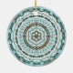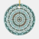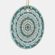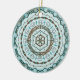 Esta mandala de círculo concéntrico presenta capas de motivos blancos, turquesa y marrones inspirados en las tejas celtas y la henna india, como las viñas, las cintas y las flores de loto.