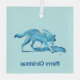 Un lobo azul estilizado (Canis lupus) proyecta una sombra a medida que pasa por un terreno nevado. También aparece un texto de personalizable que dice "Feliz Navidad".