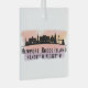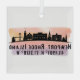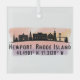 El ornamento de cristal presenta la silueta de la isla de Newport Rhode con coordenadas de mapa en un fondo de salpicadura de acuarela.