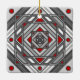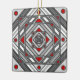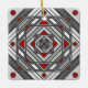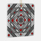 Una mandala cuadrada concéntrica toma la apariencia de un túnel que atrae al espectador con una combinación de líneas anguladas, triángulos y círculos en tonos grises, rojos y blancos para casi crear una ilusión óptica.