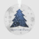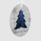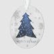 Decore su árbol esta temporada de vacaciones con un adorno de árbol de Navidad azul festivo. El diseño ornamental incluye un vibrante y festivo árbol de Navidad adornado con caídas de copos de nieve grises y blancos con un saludo de vacaciones. También hay artículos de regalo y de vacaciones disponibles con este diseño.