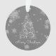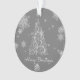 Decore su árbol esta temporada de vacaciones con un árbol de Navidad plateado y un adorno de copas de nieve. El diseño ornamental incluye un vibrante árbol de Navidad artístico con copos de nieve en caída y un fondo gris oscuro. También hay artículos de regalo y de vacaciones disponibles con este diseño.