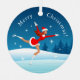 En la parte delantera de este metalizado adorno se puede ver el ilustracion de un hermoso patinaje artístico chica en la pista del parque de la ciudad. La joven lleva un traje de Santa y un gorra. En la parte de atrás del adorno hay un árbol de Navidad decorado con luces rojas y amarillas. Ambas partes tienen letras personalizadas "¡Feliz Navidad!". Si necesitas ayuda para transferir este diseño a otro producto, no dudes en contactarme a través de Zazzle. ¡Que tengas un gran día!