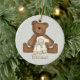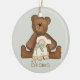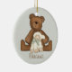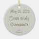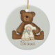 Primer ornamento del recuerdo de la comunión santa con el oso y el cordero de peluche en fondo verde suave.