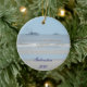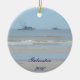 Este ornamento del bonito ofrece una fotografía de la playa en el frente y la parte posterior. Los barcos de pesca puntean el horizonte. En el frente es un punto para un mensaje de encargo o usted puede quitar el texto todo junto. Perfeccione para alguien que ama viajar.