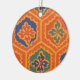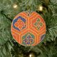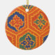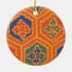 Un adorno redondo con un patrón étnico de azulejos florales en naranja, amarillo dorado, terracota, azul y verde, de una imagen de pantalla de Judy Adamson.