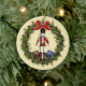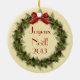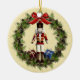 Hermosa muñeca de petardos rojos en corona de flores alrededor de Joyeux Noël, adorno navideño francés. Este adorable adorno de cerámica de arte vacacional de doble cara cuenta con un petardo rojo en el centro de una corona de vacaciones con pinos y bayas. La parte trasera también tiene una hermosa corona y arco con las palabras "Joyeux Noël" - Feliz Navidad en francés, ¡y el año! Una maravillosa adición a tu colección de adornos, decoración de vacaciones y un gran regalo para la familia, amigos y alguien que ama al petirador!