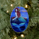 Los ornamentos ovales del navidad, una sirena hermosa cenan la langosta en las rocas del mar en la puesta del sol. Ornamento oval del navidad cena de la fantasía la "de la sirena" del arte de la pintura por Sue Halstenberg.