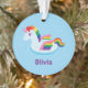 Un ornamento colorido que ofrece un flotador con alas lindo de la piscina del unicornio con los colores del arco iris para su melena, cola y alas. Personalice con el nombre del niño.