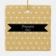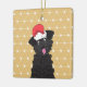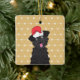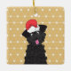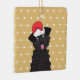 Cuidadoso, de pelo rizado, negro, caniche de té con gorra de Santa Claus rojo encima de la cabeza delante. Ojos adorables y lengua rosa fuera. Fondo de rombo geométrico dorado y blanco y fondo de patrón de puntos en ambos lados. Nombre del personalizable y fechas en la parte posterior. Ilustracion gráfico de perros por: Lori@SaltTownStudio