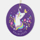 Personalice y dedique el ornamento navideño unicornio con unicornio arcoiris con una mariposa enmarcada con flores sobre un fondo morado oscuro.