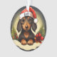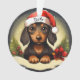 Presentamos a nuestros encantadores Navidades Dachshund Ornament, la combinación perfecta para darle calidez a su decoración de vacaciones. Adornado con un gorra de Navidades festivos y ojos brillantes con alegría navideña, este adorable personalizado Dachshund está listo para llenar tu casa de alegría. El vibrante gorra de los Navidades rojos añade un alegre toque de color, con una suave pompa blanca que parece bailar con gusto. Puede cambiar el nombre del perro o eliminarlo. Al fondo está la cita" Felices Fiestas, 202X". Este texto también se puede cambiar. Para el amante de Dachshund, este ornamento se encarga de recibir los cumplidos de todos los que lo ven. ¡Pida la tuya hoy, y deja que este delicioso cachorro difunda el espíritu de los Navidades por toda tu casa!