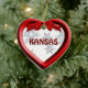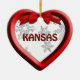 Un diseño gráfico de copos de nieve en un marco rojo estilo 3D en forma de corazón en el adorno navideño de Kansas. El ornamento tiene plantillas de texto para su personalización. ©2012charmainepaulson