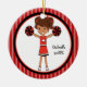 ¡Este es un adorable adorno navideño para esa animadora en tu vida! Es una adorable animadora con pelo castaño en colas de cerdo. Ella tiene dos pompones en sus manos. Lleva puesto un uniforme rojo con blanco y negro. Ella está puesta en un gran círculo interior blanco delineado en rojo y negro. El fondo es de rayas rojas claras y oscuras. Echa un vistazo a los muchos otros diseños y colores de esta línea. ¡Apreciar este mantenimiento por muchos, muchos años! © clip artesanal