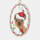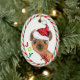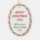 En la parte delantera de este adorable adorno navideño, una pequeña llama de color marrón lleva un sombrero de Papá Noel rojo y blanco y un arco rojo. A un lado está el colorido texto que dice "JOY". El diseño se completa con un borde de rayas de caramelo rojo y verde. La parte posterior del ornamento tiene el mismo borde, y cuatro campos de texto en rojo y verde para que el personalizar lo haga.