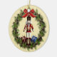 Hermosa muñeca de petardo rojo en corona de flores adorno navideño. Este adorable adorno de cerámica de arte vacacional de doble cara cuenta con un petardo rojo en el centro de una corona de vacaciones con pinos y bayas. La parte de atrás también tiene una hermosa corona y arco con las palabras "¡Feliz Navidad" y el año! Una maravillosa adición a tu colección de adornos, decoración de vacaciones y un gran regalo para la familia, amigos y alguien que ama al petirador!