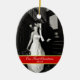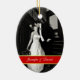 Elegante adorno oval de cerámica con una fotografía boda personalizada que cubre todo el adorno en ambos lados. Una banda de tonos rojo y dorado, en la parte inferior hay un texto personalizado blanco listo para personalizar. Añade tu propia imagen boda en la parte delantera y trasera. Maravilloso recuerdo que conserva su adorno para los recién casados y sus familias.