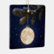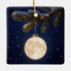 Un adorno navideño radiante de luna llena está elegantemente suspendido de una rama de pino empolvada de nieve, rodeado por un brillante tapiz de estrellas en el cielo nocturno. Se puede cambiar o eliminar todo el texto.