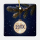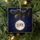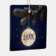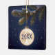 Un adorno navideño radiante de luna llena está elegantemente suspendido de una rama de pino empolvada de nieve, rodeado por un brillante tapiz de estrellas en el cielo nocturno. Se puede cambiar o eliminar todo el texto. Año editable.