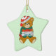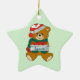 Este adorable adorno navideño personalizado para niños incluye un oso de peluche vestido con una gorra de Navidad roja y blanca y un verde azulado jersey verde. El oso sostiene un paquete decorado con un arco rojo, y personalizado con el propio nombre de su hijo. La imagen se coloca sobre un fondo turquesa claro. La parte posterior del ornamento es a juego con el color turquesa, con un espacio suficiente para la personalización. ¡Es fácil cambiarlo para decir lo que quieras!