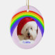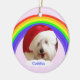 Este adorno navideño conmemorativo de perros mascotas presenta un arco iris justo encima de la cabeza de tu perro en un fondo rosado. El diseño puede ser personalizado con el nombre de su perro debajo de la foto de su perro. Una manera maravillosa de honrar a tu perro especial en los Navidades. Derechos de autor ornamentsbyhenis