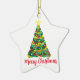 Adorna tu árbol de vacaciones con este adorno festivo que incluye un colorido árbol de Navidad con el saludo "Feliz Navidad" en letras rojas contra un fondo blanco en un lado, y rojo brillante sin ningún diseño en el otro lado. Hay varias formas y tamaños disponibles. Obra de arte de la ropa y los coleccionables de Buttercup.
