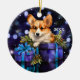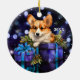 Perro de corgi rojo y blanco. escena de navidades en el fondo.