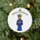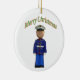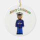 Este adorno está decorado por un lado con un marine de juguete y las palabras "Feliz Navidad" y por el otro con un árbol de Navidad y las palabras "Feliz Navidad".