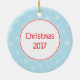 Este adorno vacacional incluye un muñeco de nieve festivo con una bufanda roja. El fondo es azul claro con copos de nieve cayendo.