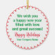 Personaliza fácilmente nuestro ornamento de porcelana con tu propio saludo de vacaciones y nombre de compañía o familia para un regalo y saludar todo en uno. El nombre del destinatario puede ir en la parte posterior para hacerlo extra especial. Este adorno impreso de personalizado puede ser una buena alternativa no confesional a una tarjeta de Navidad. No hay cantidad mínima de pedido ni cargo de instalación.