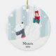 El adorno navideño del oso polar lindo rodeado de árboles de invierno y fondo de nieve. Personaliza con nombre y año.