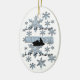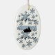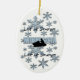 Diseño gráfico de copos de nieve y moto de nieve del artista/diseñador Charmaine Paulson en un adorno de Navidad. El adorno tiene el texto "Let it Snow Minnesota", y plantillas para su personalización.