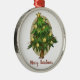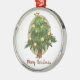 Ornamento ovalado con percha de cinta roja. Diseño original de árbol de Navidad con el mensaje rojo "¡Feliz Navidad!" debajo.