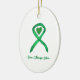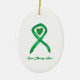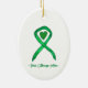 El adorno incluye la pintura de una cinta de reconocimiento verde. El arte de la cinta de conciencia verde puede ser personalizado con mensajes personalizados para hacer ornamentos de gran causa o colgantes para recaudadores de fondos, Navidades de concientización o regalos de vacaciones, u otros eventos o ocasiones especiales. El color de la cinta de sensibilización verde significa el apoyo al cáncer suprarrenal, la enfermedad celiaca, el trastorno bipolar, la protección del medio ambiente, la donación de médula ósea, la enfermedad renal, la parálisis cerebral, la alfabetización, la artritis (EE.UU.), la donación de tejidos, el trasplante de órganos, el trasplante de células madre, la lesión de la médula espinal, la depresión, la salud mental, la lesión traumática, la enfermedad mitocondrial (C.diff.) y niños desaparecidos para nombrar algunos. Kelly Green Ribbon es para el cáncer de Gallbladder/Bile Duct. Ver más de nuestro arte en AwarenessGallery.com.