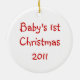 Un bebé con un gorro lleno de texto rojo y rojo que dice "Navidades bebé" en un adorno que se puede personalizar fácilmente para la primera Navidad del bebé.